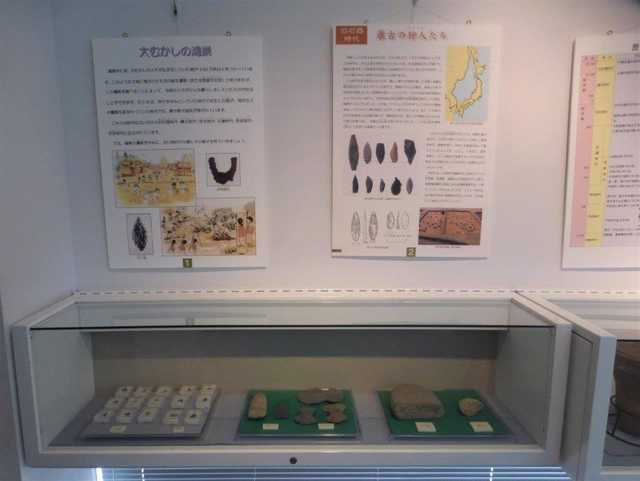 「大昔の鴻巣」と「最古の狩人たち」の展示、ガラスケース内に土器類が展示されている。