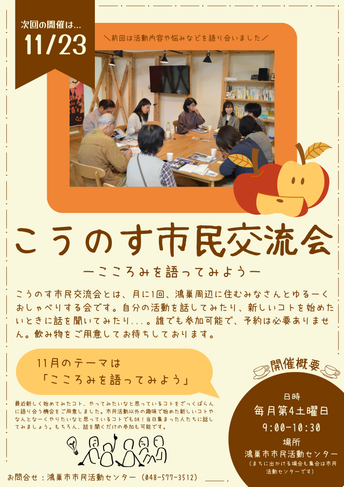 10月のテーマは「知ってもらおうあなたの活動」でした。 こうのす市民交流会が10月からリスタートということで、 今まで来れなかったけど、勇気を出して行ってみよう!と初めての方も 多くいらっしゃいました♪ ご自身の活動についてチラシを用いて語ったり、 イベントの周知の仕方やメンバー募集、つながり作りについて 意見交換して活動のブラッシュアップに繋がった方もいらっしゃるようでした👀 次回は11月23日に開催です。 ぜひご参加ください✨