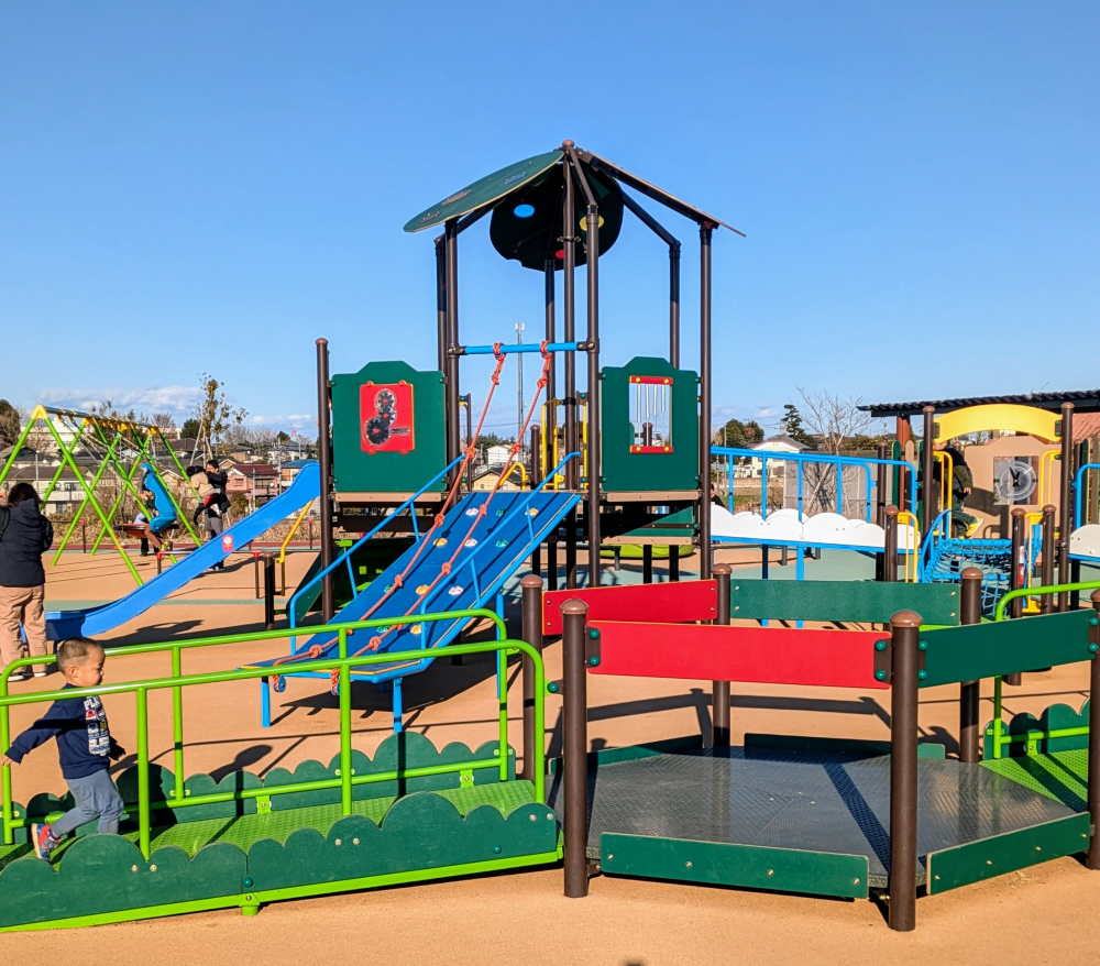 複合遊具、健康遊具、インクルーシブ遊具(誰もが一緒に遊ぶことができる遊具)、噴水広場、ドッグランといろいろなものが取り揃えられていて、子どもから大人まで楽しめます。