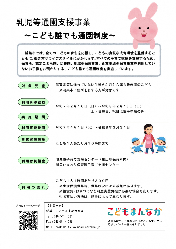 保護者が就労していないご家庭でも、こどもを誰でも保育所等の施設に通わせることのできる「こども誰でも通園制度」が令和8年本格的にスタートします。 それに先駆けて、試行的に月10時間を上限に実施されることになりました。 ご利用には登録が必要で、預け先は3か所となっています。 料金その他詳しくは鴻巣市HPのこちらをどうぞ。 問合せ:こども未来部 保育課 埼玉県鴻巣市中央1-1 新館1階 Tel:048-541-1321 鴻巣市HPより引用させていただきました。