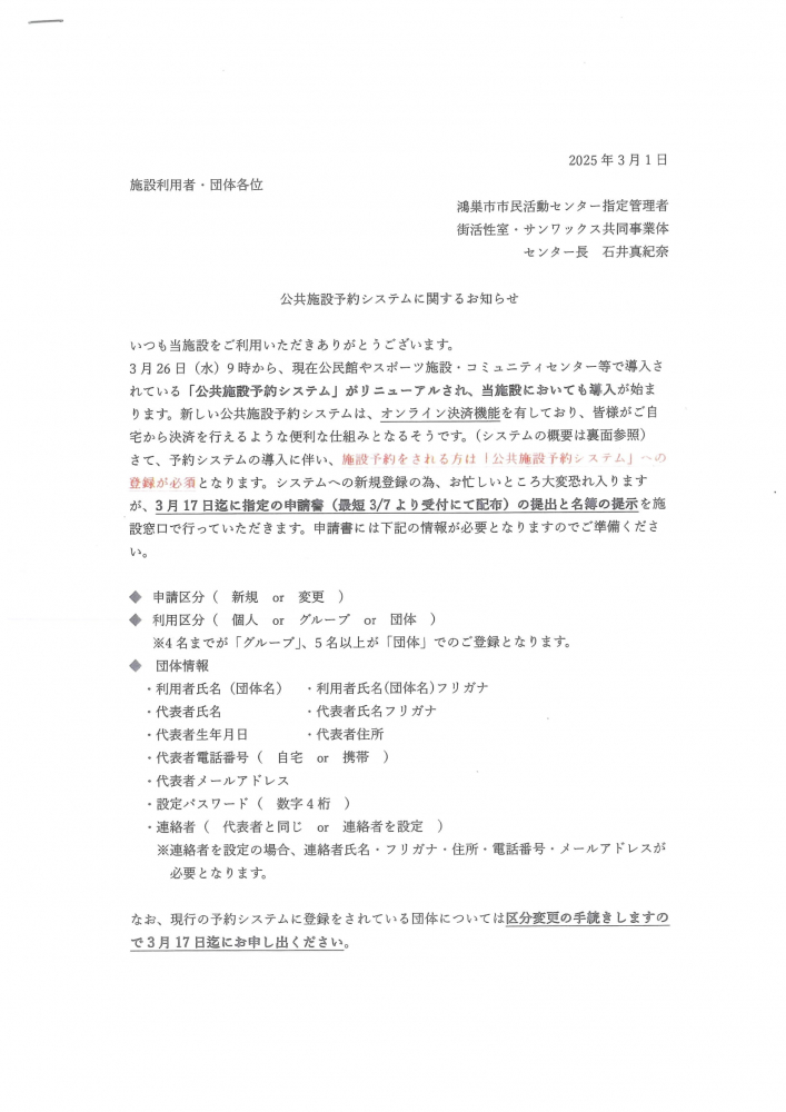 3月17日(月)までに利用登録申請書をご提出いただければ、3月26日(水)からスムーズに、リニューアルした鴻巣市公共施設予約システムをご利用することができます♪