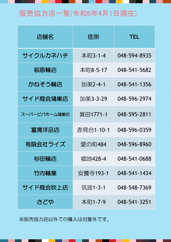 ※下記に掲載されていない市内の店舗、市外の販売店、インターネット等でのご購入は補助対象外となりますので、ご注意ください。