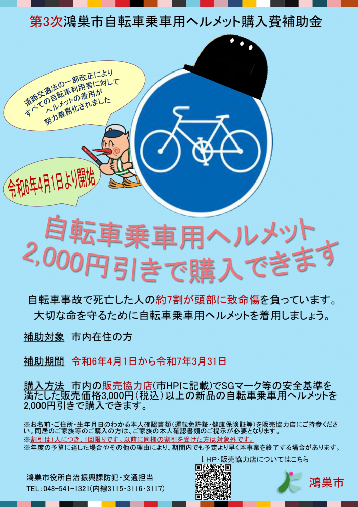 鴻巣市では、経済的な負担軽減及びヘルメット着用の促進を図るために、市内在住の自転車を利用される方の自転車乗車用ヘルメットを購入する方に対し、市が費用の一部を補助します。