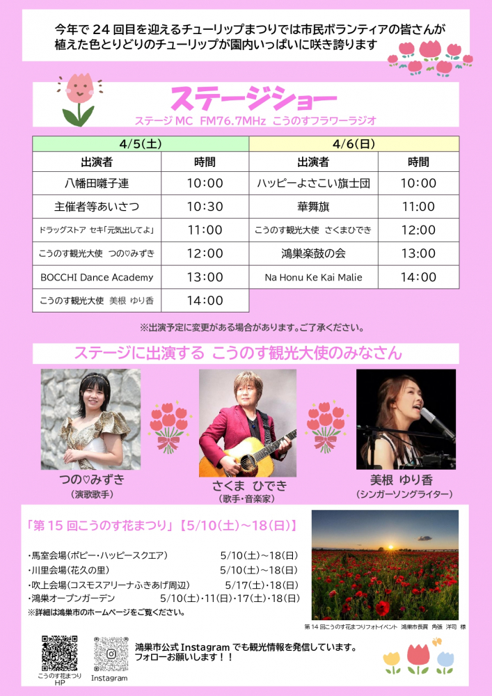 暖かくなってきてチューリップもすくすくと成長してきています。 花のオアシスでは今年もチューリップまつり🌷🌷が開催されます。 球根掘り出しをはじめ、さまざまな催しもありますので、 4月はぜひお出かけください! 鴻巣市HP内 案内ページはこちら