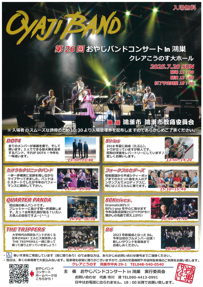 毎回、多くの来場者が訪れる「おやじバンドコンサート」がクレアこうのすで今年も開催されます。