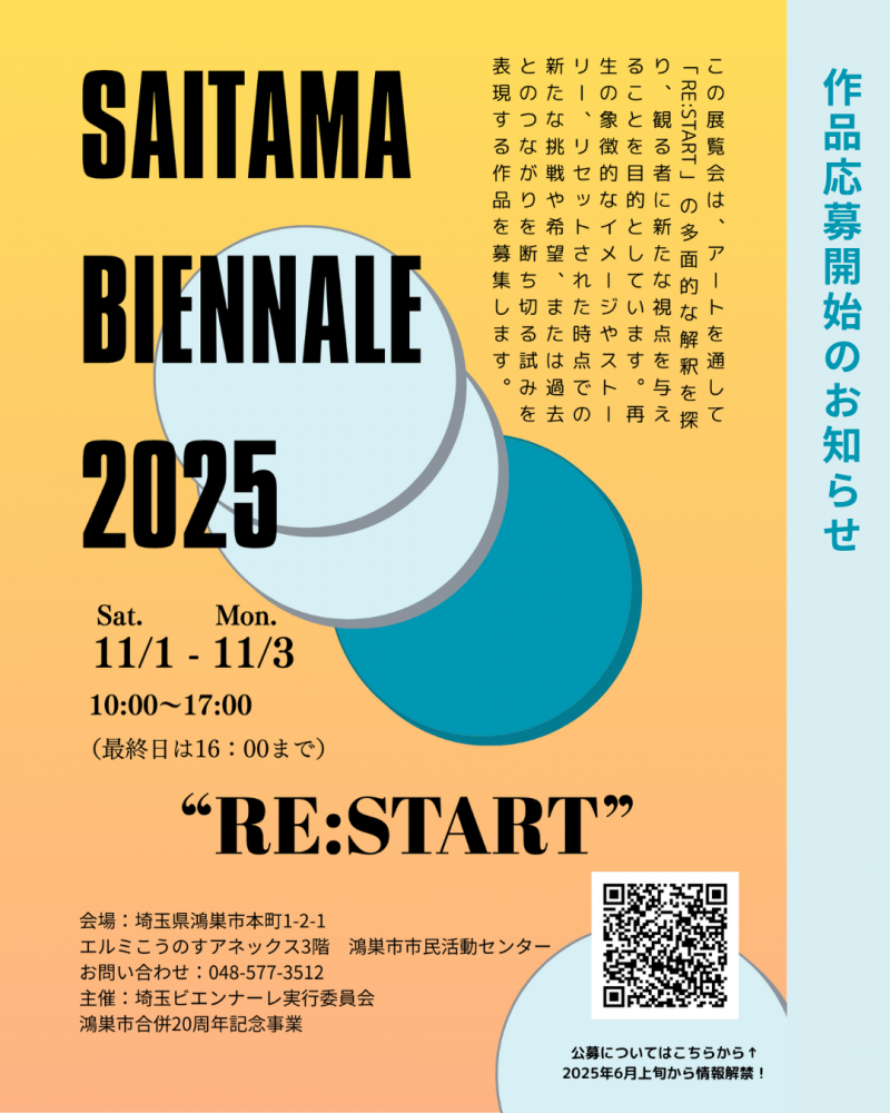 本日6月10日より鴻巣市市民活動センターで11月1日(土)~3日(月)に開催する芸術祭、埼玉ビエンナーレ2025『RE:START』に展示する作品の応募を開始します✨