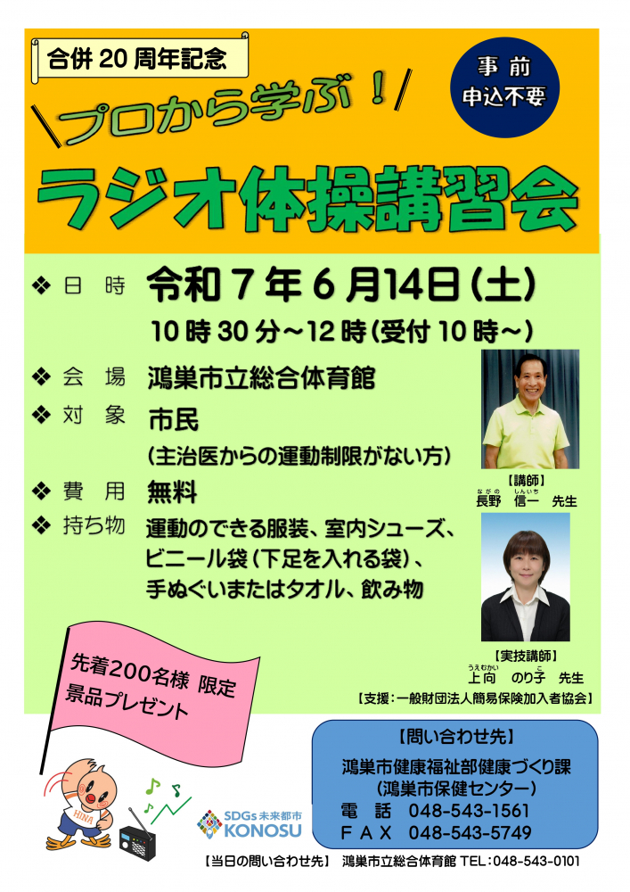 NHKテレビ・ラジオ体操に出演経験のある先生をお招きしたラジオ体操講習会が開催されます。
