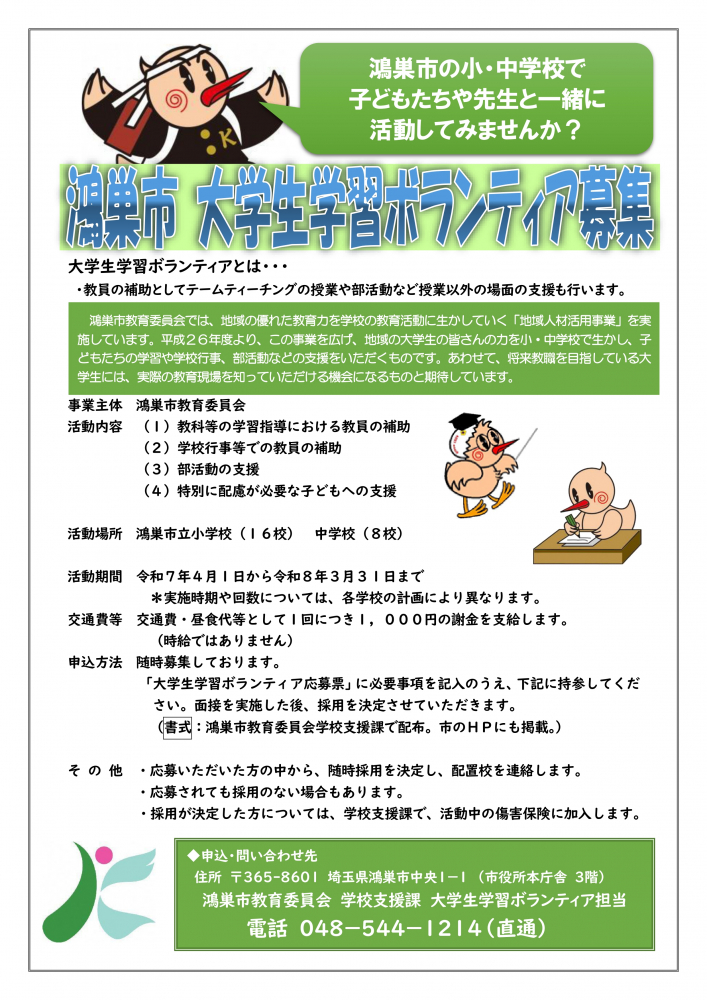 #鴻巣市 #学習ボランティア #教員志望 #教育実践 #大学生募集 #子どもと学ぶ #教育の現場
