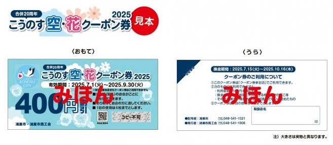 物価高騰により影響をうけている市民の方、市内事業者、各家庭への支援と地域経済の振興を目的として、「こうのす空・花クーポン券2025」を配布しています。