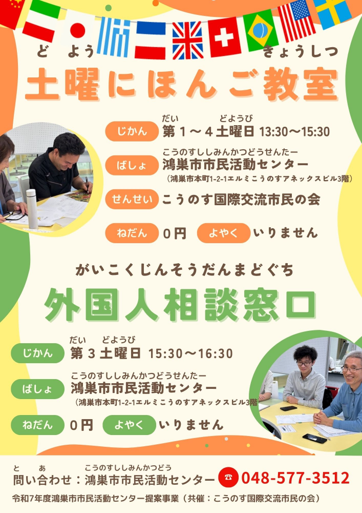 🌼土曜にほんご教室・外国人相談窓口のご案内🌼 【土曜にほんご教室】 じかん:第1~4土曜日 13:30~15:30 ばしょ:鴻巣市市民活動センター せんせい:こうのす国際交流市民の会 ねだん:0円 よやく:いりません 【外国人相談窓口】 じかん:第3土曜日 15:30~16:30 ばしょ:鴻巣市市民活動センター ねだん:0円 よやく:いりません といあわせ:鴻巣市市民活動センター ☎048-577-3512 共催:こうのす国際交流市民の会