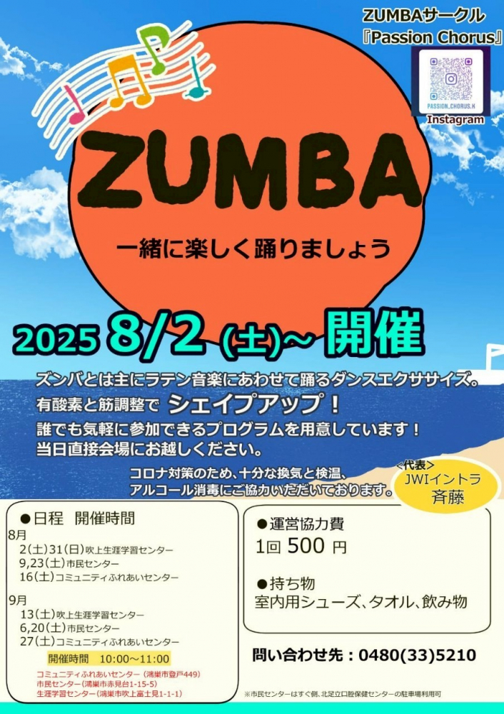 今回は市民センターで活動中のサークルをご紹介いたします ZUMBAサークルpassion chorus ラテンの音楽など世界中の曲を流してダンスを踊るサークルです 参加者は子供からシニアまで幅広い年齢層です 体を動かしてみたい方、シェイプアップしたい方は是非参加してみてください 活動日:毎週土曜日 時間:10:00~11:00 場所:市民センター・吹上生涯学習センター・コミュニティふれあいセンター 活動参加費:500円/回 持ち物:室内シューズ・タオル・飲み物 問合せ 0480-33-5210