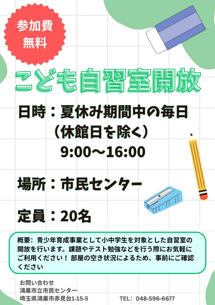 鴻巣市立市民センターでは小中学生を対象に夏休み期間中の毎日、「こども自習室開放」を無料で開催しております!