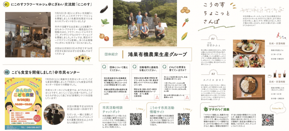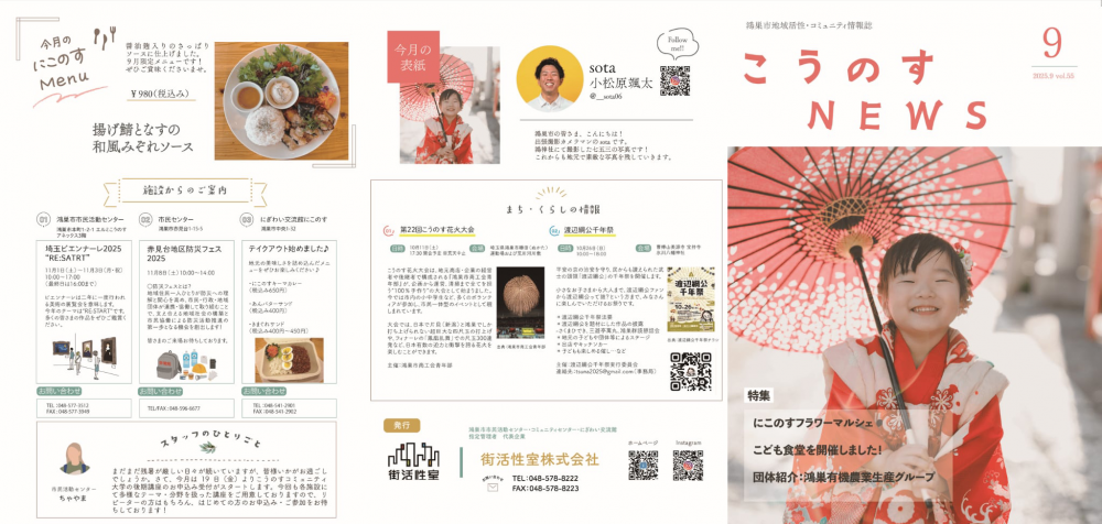 9月号では、7月ににぎわい交流館「にこのす」で開催した「にこのすフラワーマルシェ」の様子や、鴻巣市で活動する団体の紹介を掲載しました。鴻巣市のまち情報をお届けする「こうのすちょこっと散歩」では、鴻巣市内の個人店や観光スポットなど、さまざまなおすすめの場所をご紹介しています♪