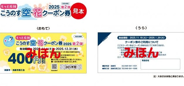 電気・ガス・食料品などの値上がりで影響を受けている皆さんや、市内の事業者を応援するために、「“もっと応援”こうのす空・花クーポン券2025(第2弾)」を配付します♬クーポン券を使って、市内でのお買い物やお食事を楽しみながら、地域を一緒に盛り上げましょう! 利用期間:11月1日(土)~12月31日(水) ※配布は1世帯あたり1部のみとなります。市内在勤・在学の方にも1世帯あたり1部のみ配布します。公共施設での配布は12月26日(金)までとなります。 詳しくはコチラ