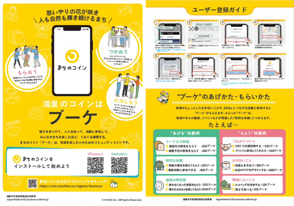 「まちのコイン」は、地域とつながるコミュニティアプリで、SDGsの達成につながる活動に参加したり、ちょっとしたお手伝いをするとブーケ(アプリ内で使用するポイント)がもらえます。