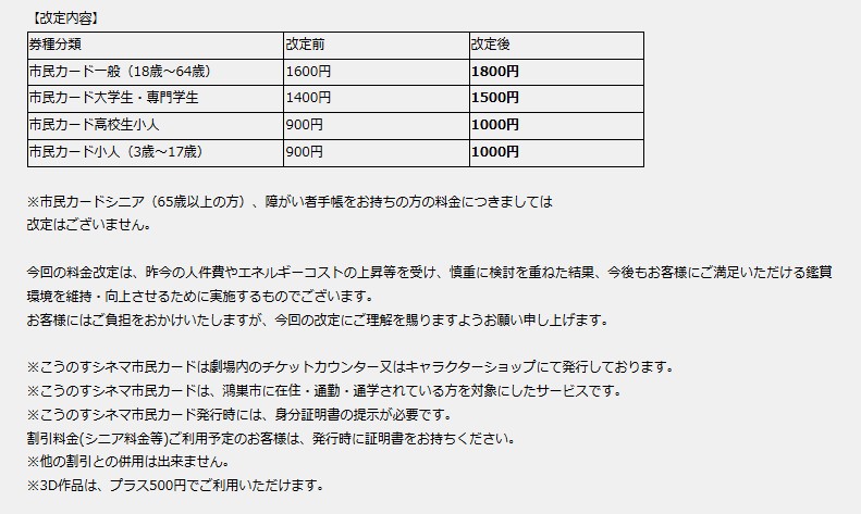 2025年12月2日(火)上映分より、「こうのすシネマ市民カード割引」の鑑賞料金は下記の通りになります。