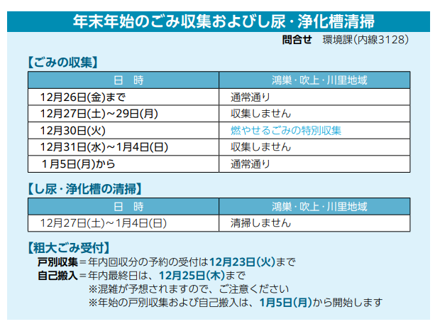 鴻巣市 年末年始のごみ収集等のお知らせ