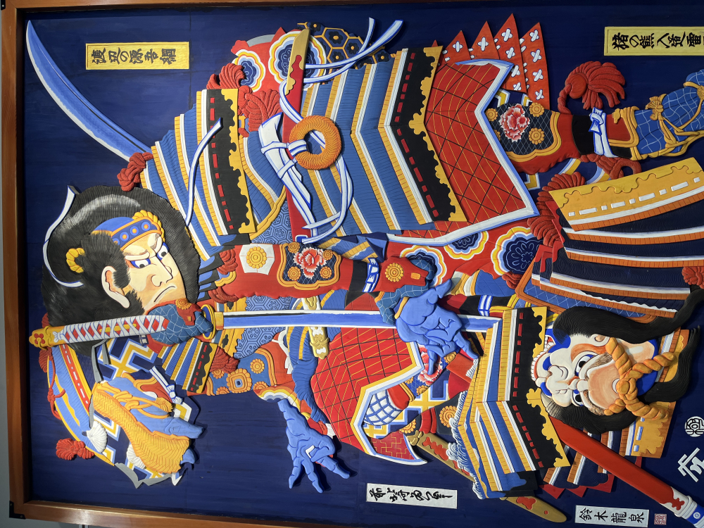 この作品は鴻巣ゆかりの武将、渡辺綱を立体版画に起こしたもので、錦絵が今にも画面から飛び出してくるような躍動感を感じさせる一枚です。