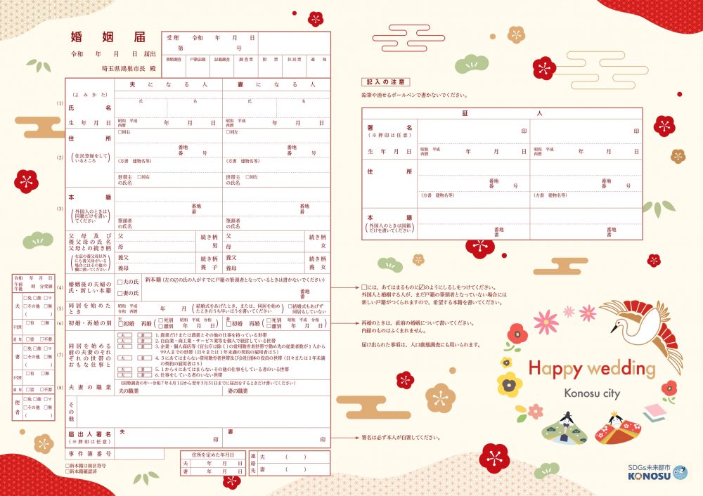 鴻巣市のシンボルでもあるコウノトリをはじめ、花やひな人形のイラストなどを加えた鴻巣市らしいデザインの届書となっています。