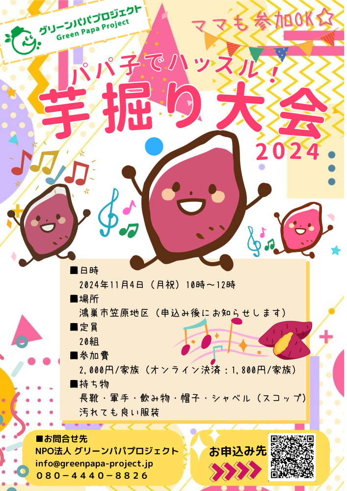 11/4(月祝)にNPO法人グリーンパパプロジェクトさん主催で「パパ子でハッスル! 芋掘り大会」を開催します!